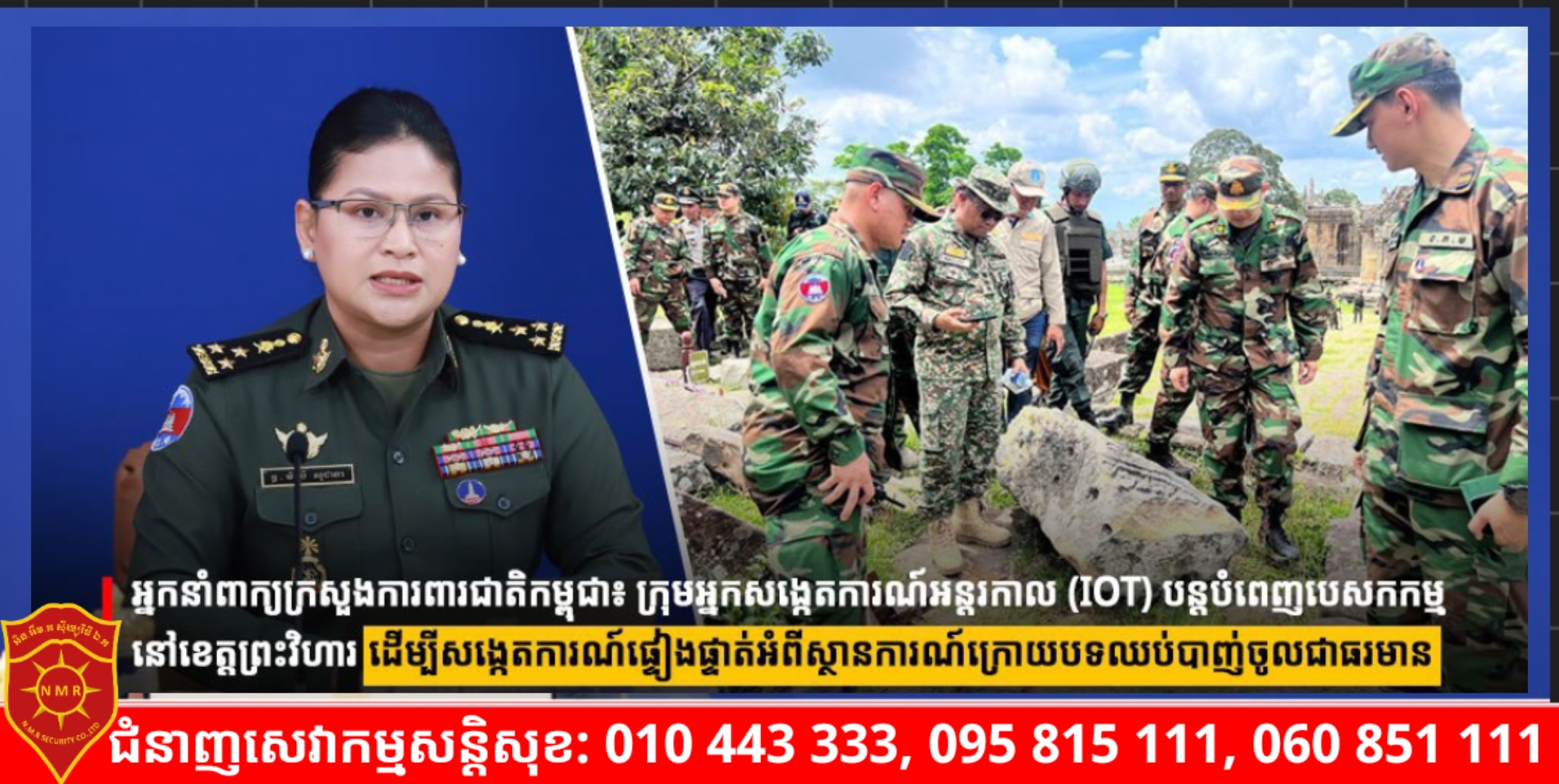 ក្នុងសន្និសីទសារព័ត៌មាន នៅល្ងាចថ្ងៃទី២១ ខែសីហា ឆ្នាំ២០២៥នេះ អ្នកនាំពាក្យក្រសួងការពារជាតិកម្ពុជា បានគូសបញ្ជាក់ថា មកទល់ពេលនេះ ក្រសួងការពារជាតិកម្ពុជា បានសម្របសម្រួលជូនក្រុមអ្នកសង្កេតការណ៍អន្ដរកាល IOT ដែលមានតំណាងមកពី៥ប្រទេសចូលរួម គឺម៉ាឡេស៉ី ឥណ្ឌូនេស៉ី ឡាវ ហ្វីលីពីន និងវៀតណាម ដែលដឹកនាំអនុព័ន្ធយោធាម៉ាឡេស៉ី ប្រចាំកម្ពុជា ដែលបានធ្វើដំណើរទៅកាន់ខេត្តព្រះវិហារ និងបានពិនិត្យតំបន់ជុំវិញប្រាសាទព្រះវិហារ។