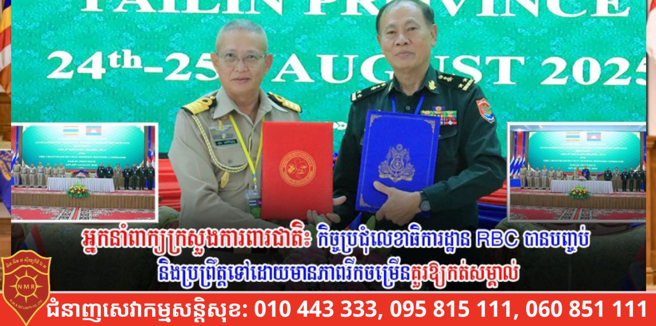 ភ្នំពេញ)៖ កិច្ចប្រជុំលេខាធិការដ្ឋាន នៃគណៈកម្មាធិការព្រំដែនថ្នាក់យោធភូមិភាគកម្ពុជា-ថៃ (RBC) រវាងយោធភូមិភាគទី៥របស់កម្ពុជា និងបញ្ជាការដ្ឋានការពារព្រំដែនច័ន្ទបុរី-ត្រាតរបស់ថៃ ដែលដឹកនាំដោយ ឧត្តមសេនីយ៍ទោ សរ គឹមប៉ាក់ ប្រធានក្រុមលេខាភាគីកម្ពុជា និងវរនាវីឯក គិទិផុន គុណសិរិប៉នញ៉ូ ប្រធានក្រុមលេខាភាគីថៃ បានចាប់ផ្តើមនៅវេលាម៉ោង ៩:២៥នាទីព្រឹក នាថ្ងៃទី២៤ ខែសីហា ឆ្នាំ២០២៥ ហើយបានបញ្ចប់នៅវេលាម៉ោង ០២៖០០នាទីរសៀសថ្ងៃដដែល ដែលកម្ពុជាធ្វើជាម្ចាស់ផ្ទះ នៅខេត្តប៉ៃលិន ព្រះរាជាណាចក្រកម្ពុជា ស្របតាមកម្មវិធីដែលភាគីទាំងពីរបានឯកភាពគ្នា។