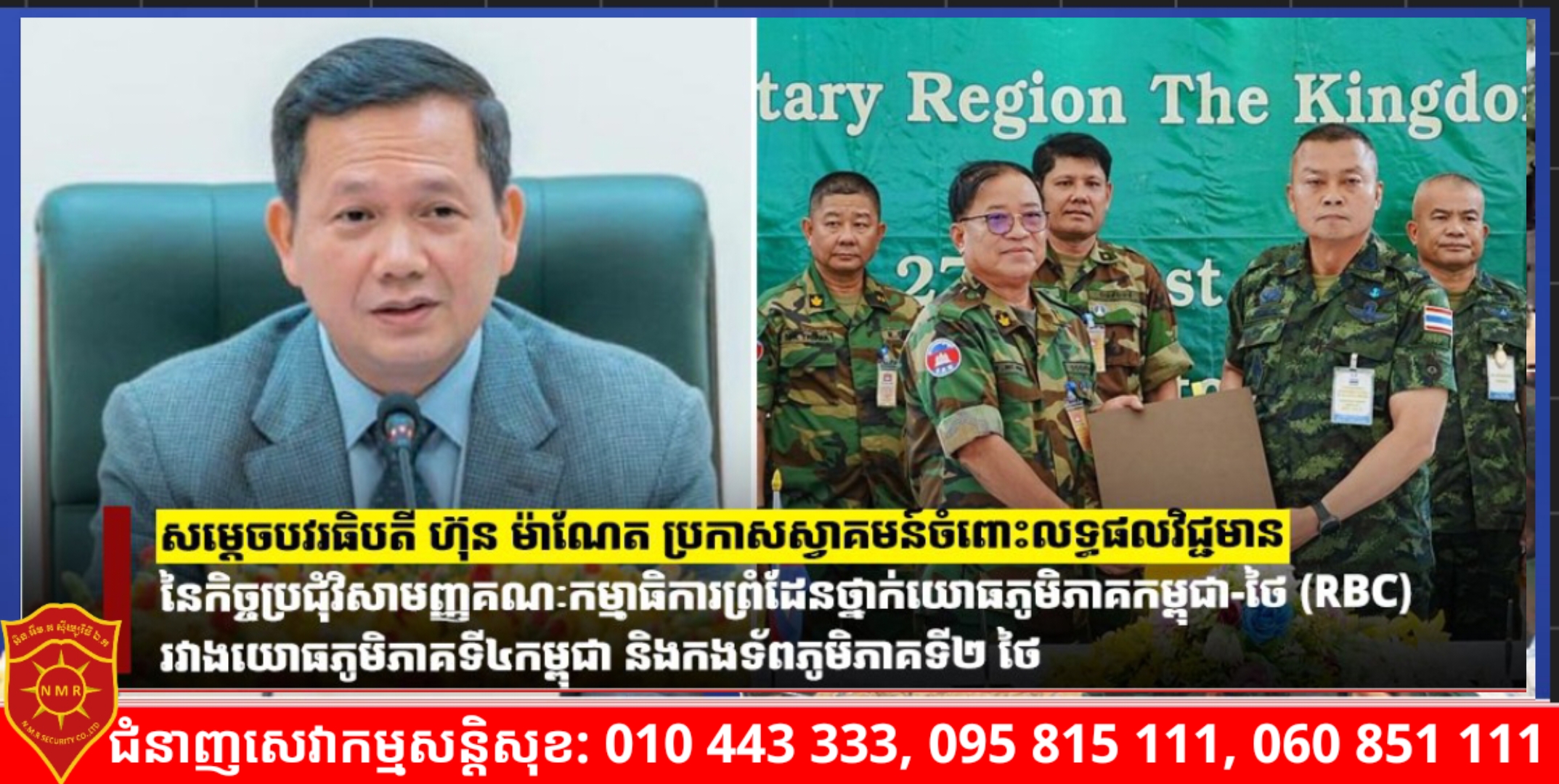 ភ្នំពេញ)៖ សម្តេចបវរធិបតី ហ៊ុន ម៉ាណែត នាយករដ្ឋមន្ត្រីនៃកម្ពុជា នៅមុននេះ បានប្រកាសតាមបណ្តាញសង្គម ស្វាគមន៍ចំពោះលទ្ធផលវិជ្ជមាននៃកិច្ចប្រជុំវិសាមញ្ញគណៈកម្មាធិការព្រំដែនថ្នាក់យោធភូមិភាគកម្ពុជា-ថៃ (RBC) រវាងយោធភូមិភាគទី៤ កម្ពុជា និងកងទ័ពភូមិភាគទី២ ថៃ នៅថ្ងៃពុធ ទី២៧ សីហា ២០២៥។
