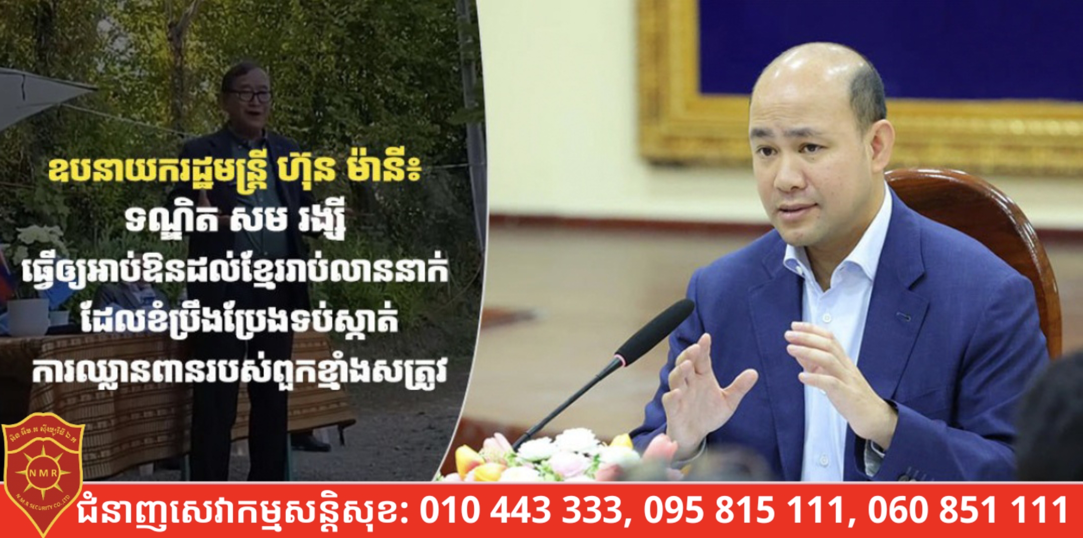 ភ្នំពេញ)៖ ឧបនាយករដ្ឋមន្ដ្រី ហ៊ុន ម៉ានី រដ្ឋមន្ដ្រីក្រសួងមុខងារសាធារណៈ បានចាត់ទុកសម្ដីរបស់ទណ្ឌិត សម រង្ស៉ី ដែលវាយប្រហារដល់កងទ័ពខ្មែរ ជាទង្វើមិនឲ្យតម្លៃសញ្ជាតិខ្លួនឯង និងធ្វើឲ្យអាប់ឱនដល់ខ្មែររាប់លាននាក់ ដែលខិតខំប្រឹងប្រែងទប់ស្កាត់ពីការឈ្លានពានរបស់ពួកខ្មាំងសត្រូវ។