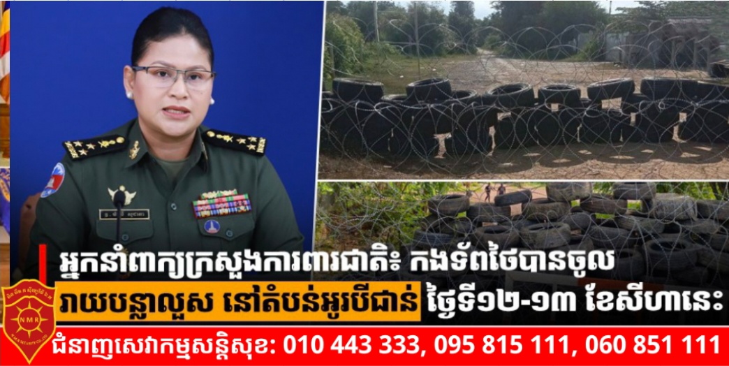 ភ្នំពេញ)៖ លោកស្រីឧត្តមសេនីយ៍ឯក ម៉ាលី សុជាតា អ្នកនាំពាក្យក្រសួងការពារជាតិកម្ពុជា បានឲ្យដឹងថា នៅថ្ងៃទី១២-១៣ ខែសីហា ឆ្នាំ២០២៥នេះ កងកម្លាំងប៉ារ៉ាថៃ និងតម្រួតព្រំដែនថៃ ប្រដាប់ដោយអាវុធគ្រប់ដៃ បានធ្វើសកម្មភាពមកត្រួតពិនិត្យនៅទល់មុខច្រកជោគជ័យ និងបានរាយបន្លាលួសក្នុងដែនអធិបតេយ្យកម្ពុជា ស្ថិតនៅភូមិជោគជ័យ ឃុំអូរបីជាន់ ស្រុកអូរជ្រៅ ខេត្តបន្ទាយមានជ័យ។